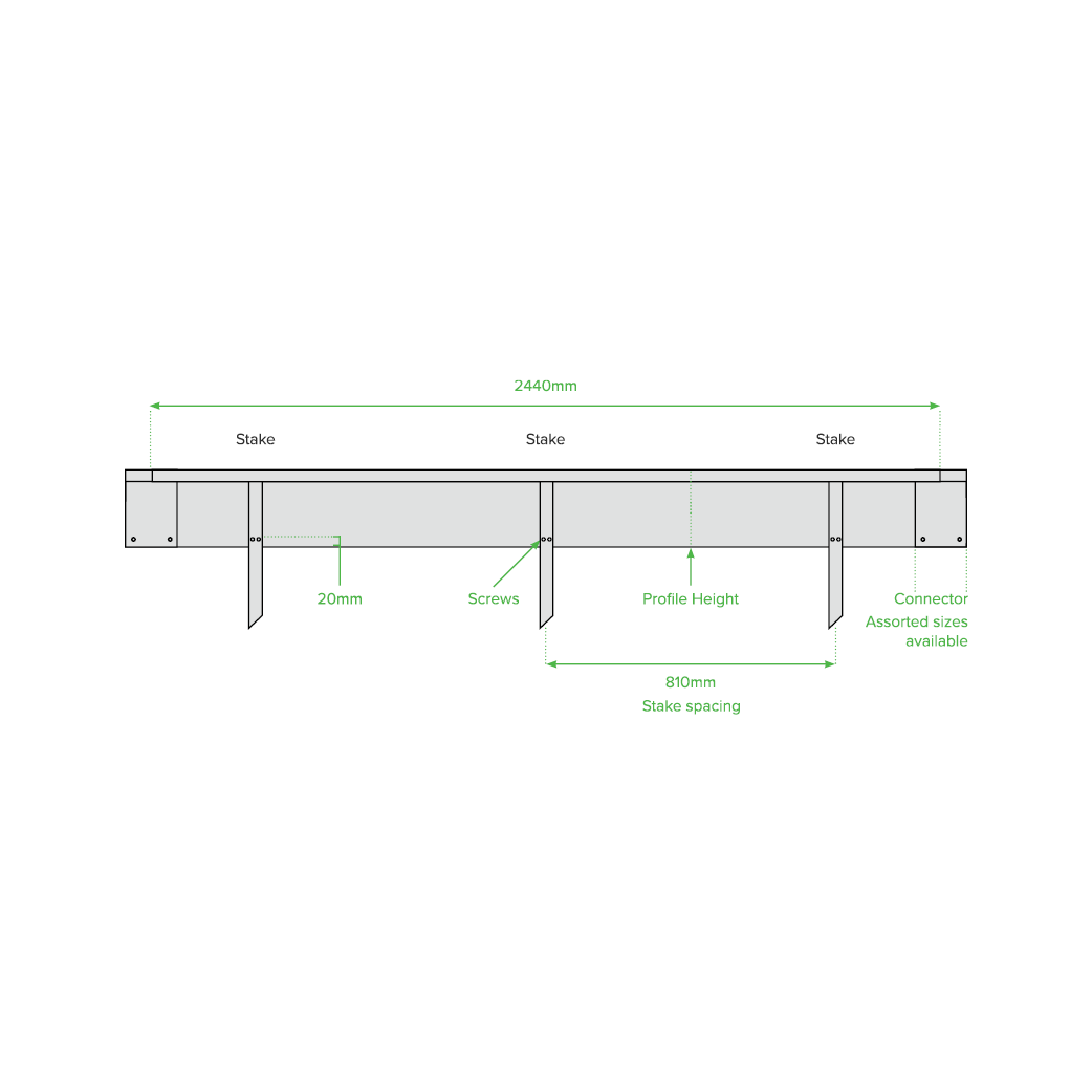 Each stake is inserted by sliding the top edge under the lip of the edging, locking the stake securely in place in the same way as standard tapered stakes. For most installations, stakes are spaced at three per 2.44 m length (approx. 813 mm apart), but heavier‑duty applications, such as 400 mm straight retaining walls or steps, should use four per length (approx. 610 mm spacing) for optimal strength.